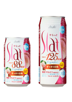 『アサヒSlat(すらっと)』は、1缶当たりのカロリーが、現在発売されている缶入りチューハイの中で“最少級”であることに加え、果汁をしっかり含んだ果肉(果実のツブ)入りで、みずみずしい果汁感を楽しめることが、カロリー・糖質(糖類)を重視する低アルコールユーザーを中心に高く評価されています。発売2年目となる2010年は、新フレーバー『アサヒSlat(すらっと)すっきり白桃』を発売し、現在のラインアップ「果肉入りレモン」「果肉入りグレープフルーツ」「すっきり白ぶどう」とあわせて全4アイテムで展開し、更なる飲用層の拡大を図ります。