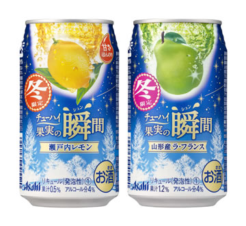 アサヒビール株式会社(本社 東京、社長 小路明善)は、低アルコール飲料『アサヒ チューハイ果実の瞬間』の冬限定商品として「瀬戸内レモン」「山形産ラ・フランス」(各缶350ml)を10月18日(火)から12月末までの期間限定で、全国で新発売します。
