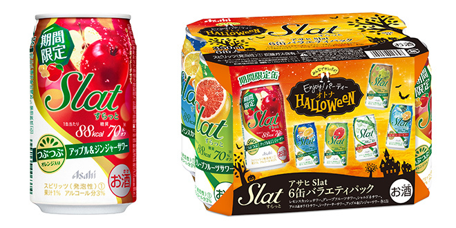 アサヒビール株式会社(本社 東京、社長 小路明善)は、低アルコール飲料『アサヒSlat(すらっと)』の新フレーバーとして、<期間限定アップル&ジンジャーサワー>を10月7日(火)から12月末までの期間、全国で新発売します。また、<期間限定アップル&ジンジャーサワー>と、基幹5フレーバーを加えた6種類のテイストを詰め合わせた6缶バラエティパック「アサヒSlat(すらっと) ハロウィンバラエティパック」を同日から数量限定で発売します。