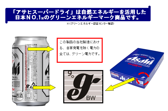 本取り組みは、全工場で製造する全ての『アサヒスーパードライ』缶350ml及びギフトセットの全てのビール類の製造に使用する購入電力相当量として、自然エネルギーである風力発電及びバイオマス発電によるグリーン電力を活用するものです。その対象となる製品にはグリーン・エネルギー・マークを表示しています。